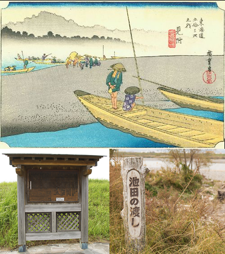 その東海道・天竜川の横断手段が「池田の渡し」だった。渡し場は3カ所あり、天竜川の水量によって「通常は下流にある下の乗船場、中程度になって流れが速くなると中流にある中の乗船場…」と使い分けられていた。料金は武士、御三家の菩提寺と朱印状を有する社寺、渡船運営費の一部を拠出している遠江国の人たちは無料。それ以外が旅人、馬、荷物の仕分け方で区分されていた。ちなみに正徳元年(1711年)では旅人一人が12文、馬1匹が36文という料金設定だった。が、これは一つの瀬を渡る料金で、当時の天竜川は中洲をはさんで瀬が二つあったため、実際はこの倍の賃料がかかった。
