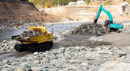 そこで2015年から、秋葉ダム下流域の瀬を再生する取り組みが始まりました。2016年に近自然河川研究所の有川崇先生が参加され、3年計画で「堆砂処理で発生した巨石*を利用して早瀬を再生する」実験が本格的にスタート。2017年3月、2018年3月にえぐられた瀬の中上流部の河床を盛土すると同時に巨石を並べて瀬の基礎となる骨格部分を作りました。そして、再生事業の最終年となった2019年1月、この実験は天竜川天然資源再生推進委員会の事業として継続され、残された下流部の造成を行なうことになりました。ここにその全貌をレポートします。