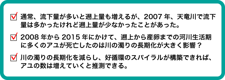 2~3年に一度訪れる海からの回帰率が高い(=遡上量が多い)年に川の濁りが長期化しなければ、十分な親魚が確保され、流下量、遡上量が増加する。これを繰り返せば資源水準が向上、つまりアユが増える。