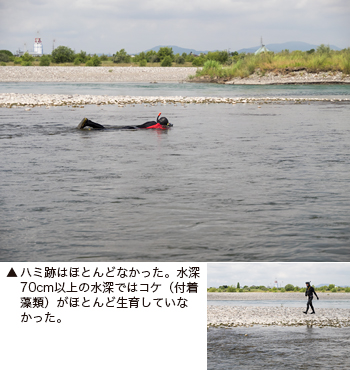 ハミ跡の被度は1~17%と著しく低かった。残念ながら、この数値は同様の調査を開始した2013年以降で最低である。この原因としては、(1)アユの生息量がかなり少ない、(2)何らかの理由であまり摂餌していない、という2つのことが考えられるが、現段階では、(1)の可能性が高いと考えられるものの、まだ明確ではない。今秋まで継続的に調査を続けることで、その実態を明らかにしたい。