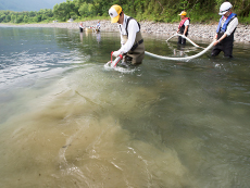 そこで、天竜川漁協ではアユの生育環境を少しでも改善するために、河床の泥や枯れた緑藻を洗い落とす“河床洗浄”を実験的に実施しており、より効率的な方法や装置の検討を続けています。